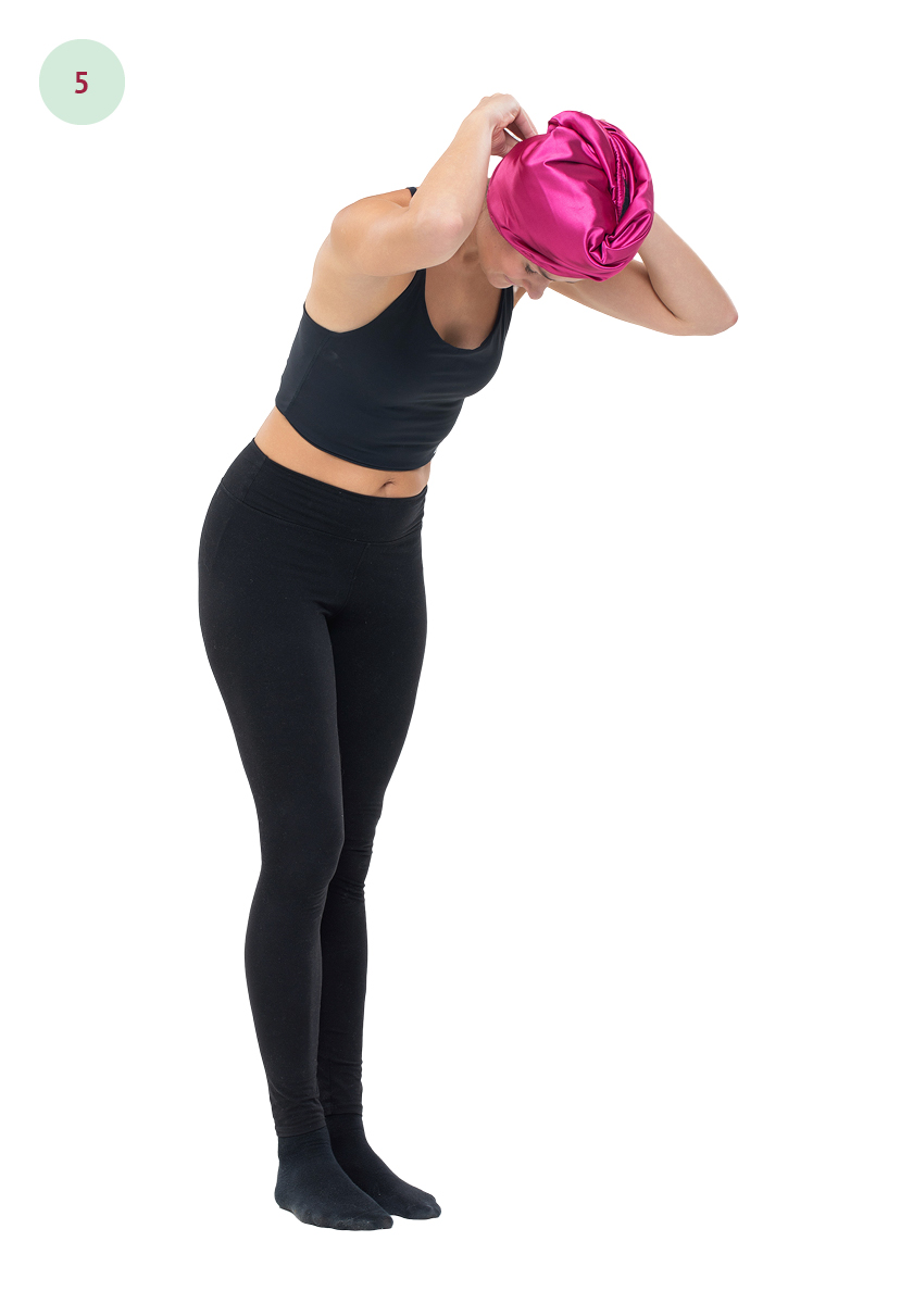 2. mokré vlasy si zamotejte, jemně vyždímejte a v předklonu nasaďte turban na hlavu knoflíkem k zátylku. Pokud si vlasy nechcete motat, můžete si je jen v předklonu nasunout do turbanu, důležité je nasazovat turban knoflíkem k zátylku.